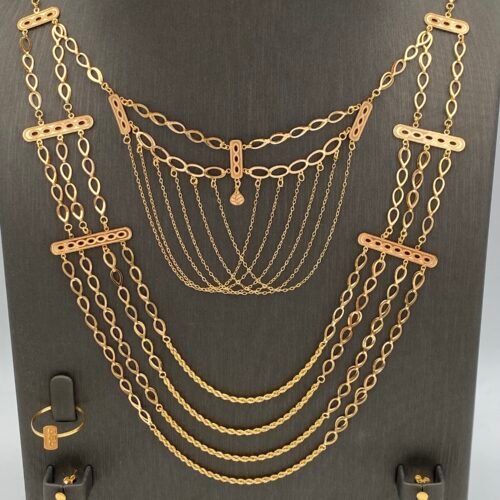 استمتعي بفخامة لا مثيل لها مع أطقم ذهب فخمة عيار 21 تجمع بين التصميم الكلاسيكي واللمسة العصرية. مثالية للسهرات والمناسبات الرسمية، وتمنحك حضورًا لافتًا يعكس ذوقك الرفيع وأناقتك اللامحدودة.