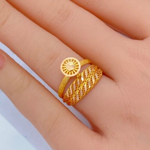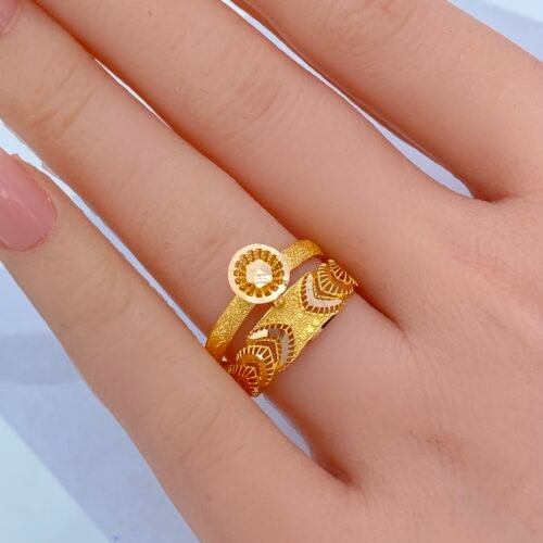 تأتي بتصاميم متنوعة تناسب كل الأذواق، من الخواتم البسيطة المزدوجة إلى التصاميم المزخرفة بالفصوص اللامعة. يجمع هذا النوع بين فخامة الذهب النقي وأناقة التفاصيل الدقيقة ليكون خيارك الأمثل للتألق كل يوم.