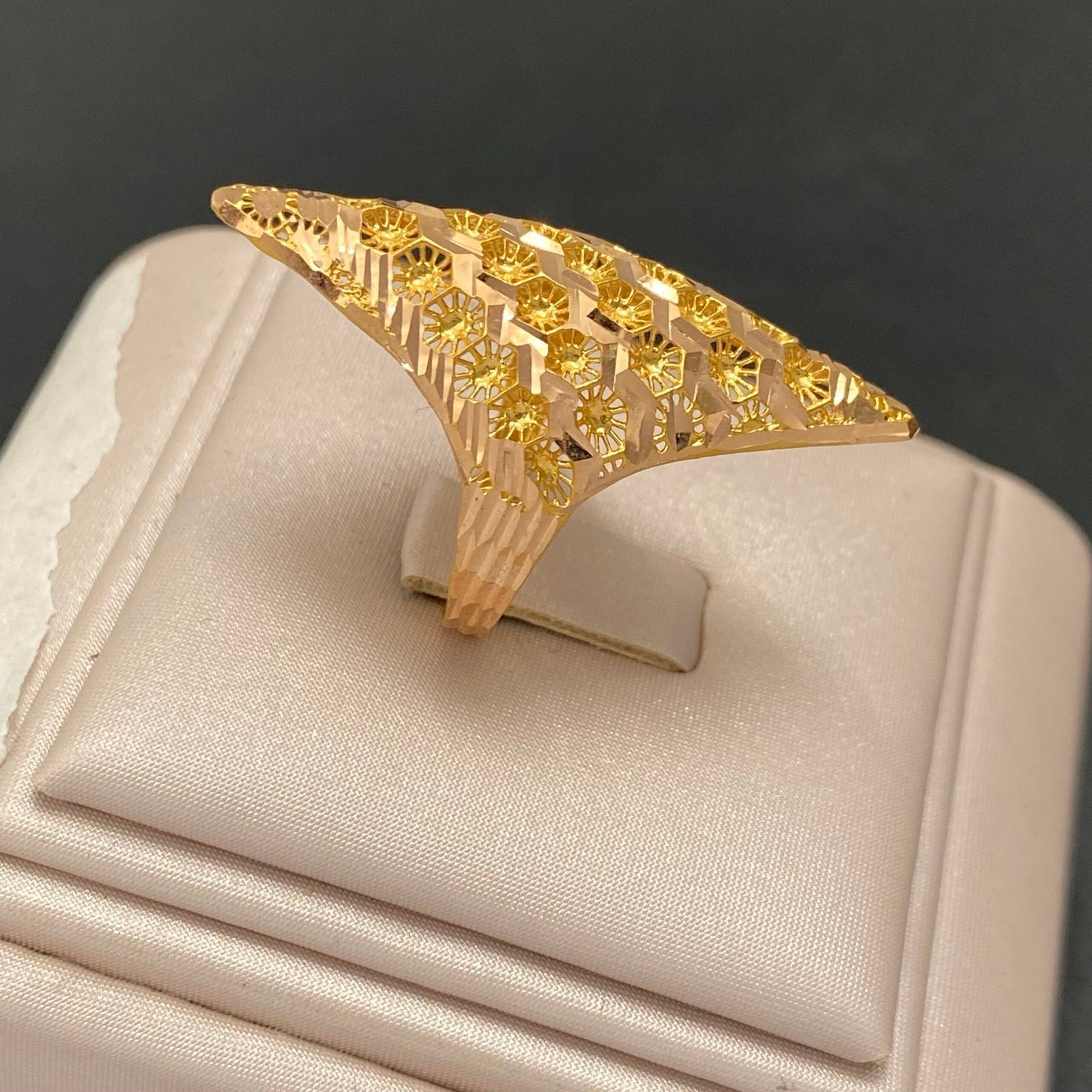 خاتم نسائي راقٍ مصنوع من ذهب صافي عيار 21 بوزن 2.57 جرام، بتصميم بسيط وأنيق يناسب جميع الأذواق. هذه القطعة الذهبية تمنحك لمسة فاخرة دون مبالغة، ما يجعلها مثالية للاستخدام اليومي، أو كهدية أنيقة تحمل قيمة ورمزًا للذوق الرفيع.