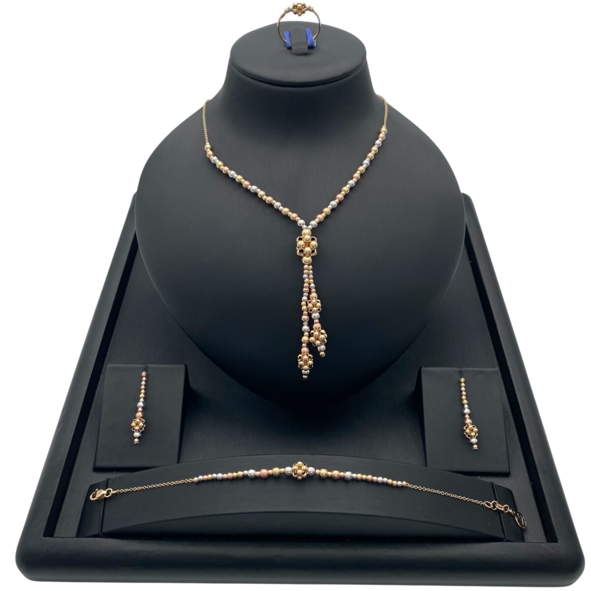- طقم ذهب خرز عيار 18 بتصميم أنيق وتعليقة متدلية تخطف الأنظار.