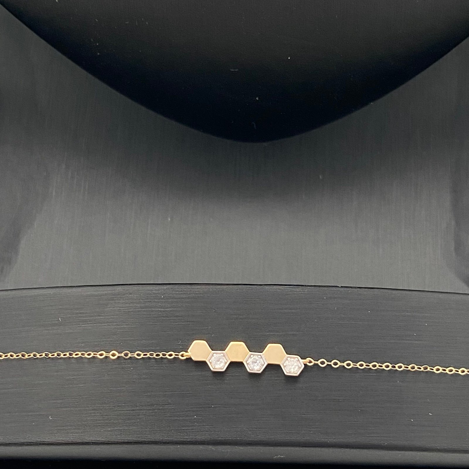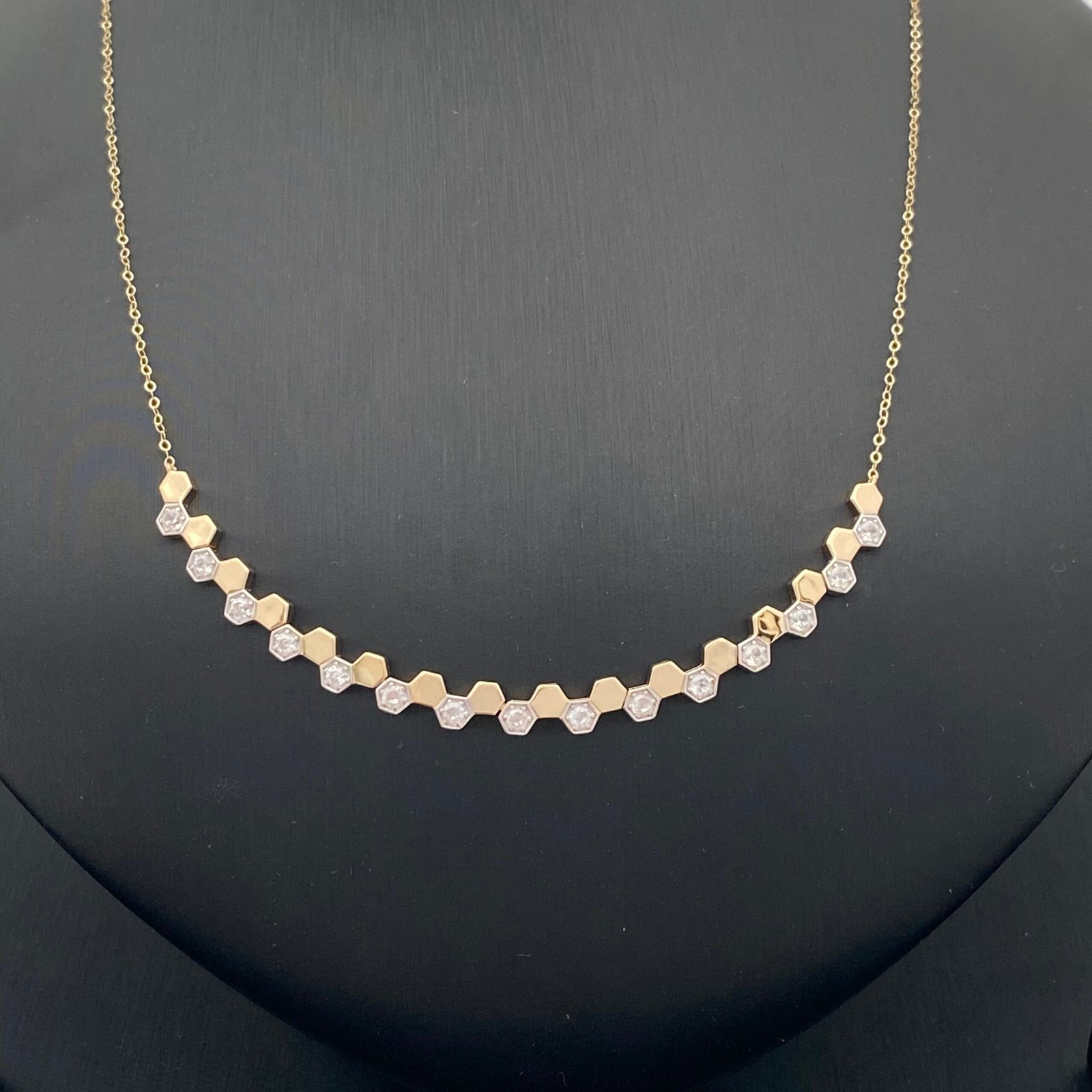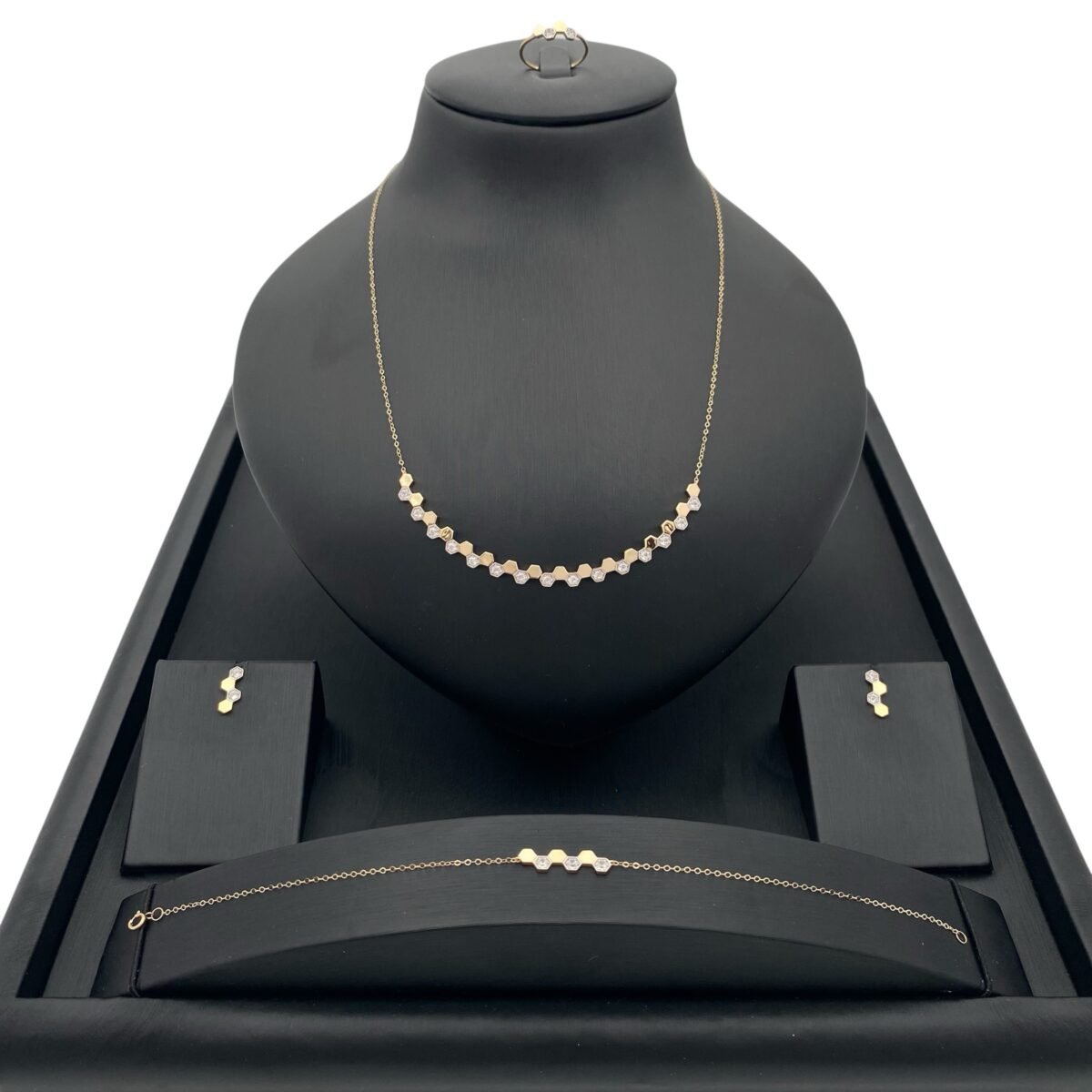 تألقي بإطلالة استثنائية تجمع بين الجرأة والرقي مع طقم خلية ذهب عيار 18 وزن 6.43 جم، المستوحى من جمال خلايا النحل ودقتها الفريدة، ويتميز هذا الطقم بتصميمه العصري الذي يعكس أنوثتك بثقة وأناقة، ليمنحك حضورًا لافتًا يعبّر عن شخصيتك القوية وذوقك الرفيع في كل مناسبة، حيث يعتبر قطعة تجمع بين الفخامة والإبداع لتكمّلي بها أناقتك بأسلوب لا يُضاهى.