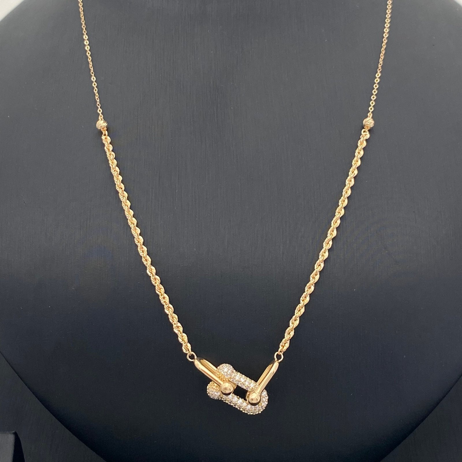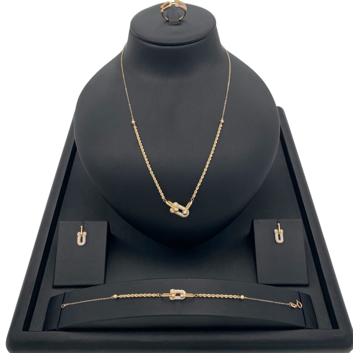 في متجر قمة زاوية الشفاء للذهب والمجوهرات في الرياض ستجدين طقم ذهب عيار 18 بتصميم “القفل المتشابك” أو (تيفاني لينك) الفاخر يجمع بين الفخامة والذوق العصري. هذا الطقم بوزن 9.07 جرام يبرز إطلالتك ويمنحك لمسة أنيقة، ويعد الخيار الأمثل لمن تبحث عن قطعة جريئة وراقية في آن واحد.