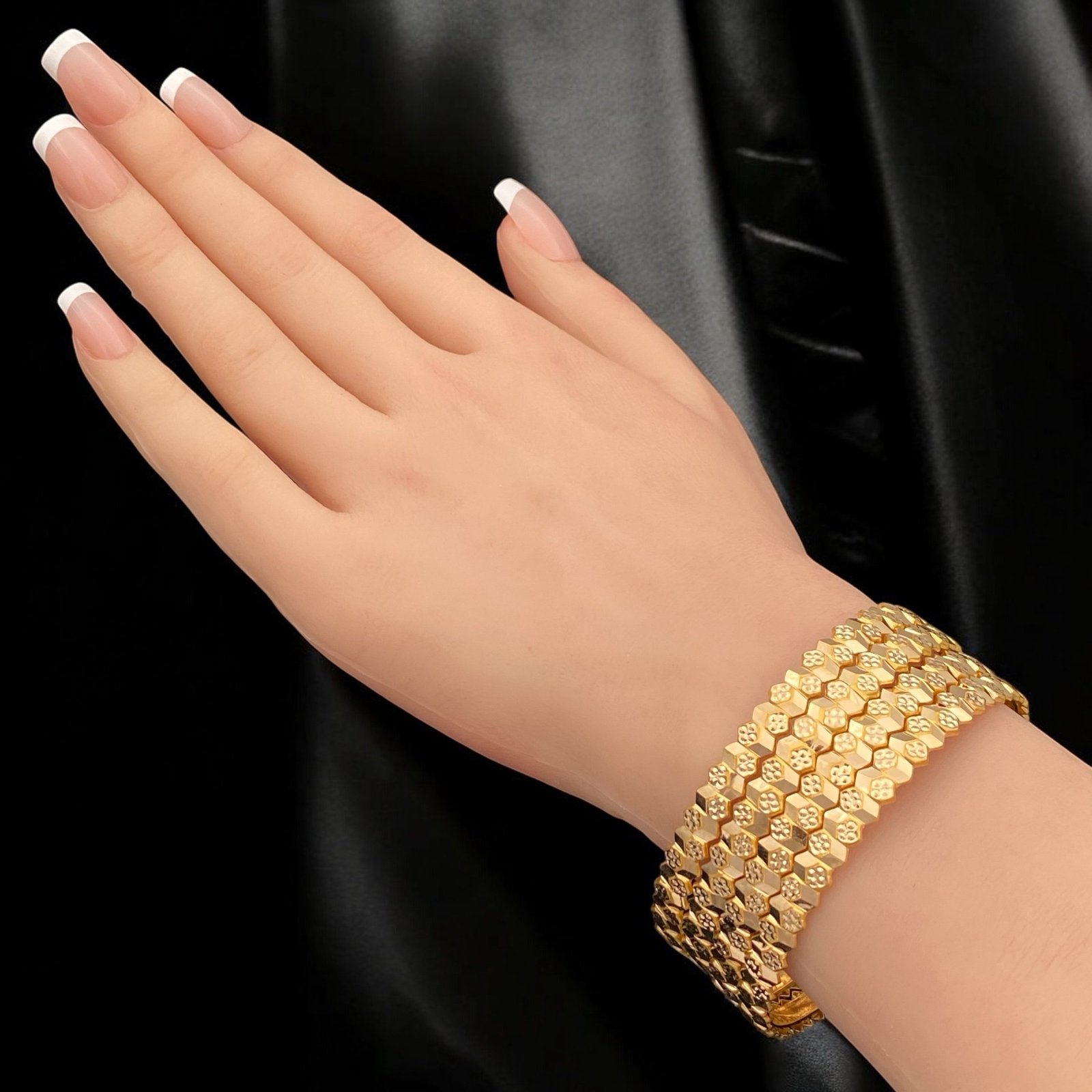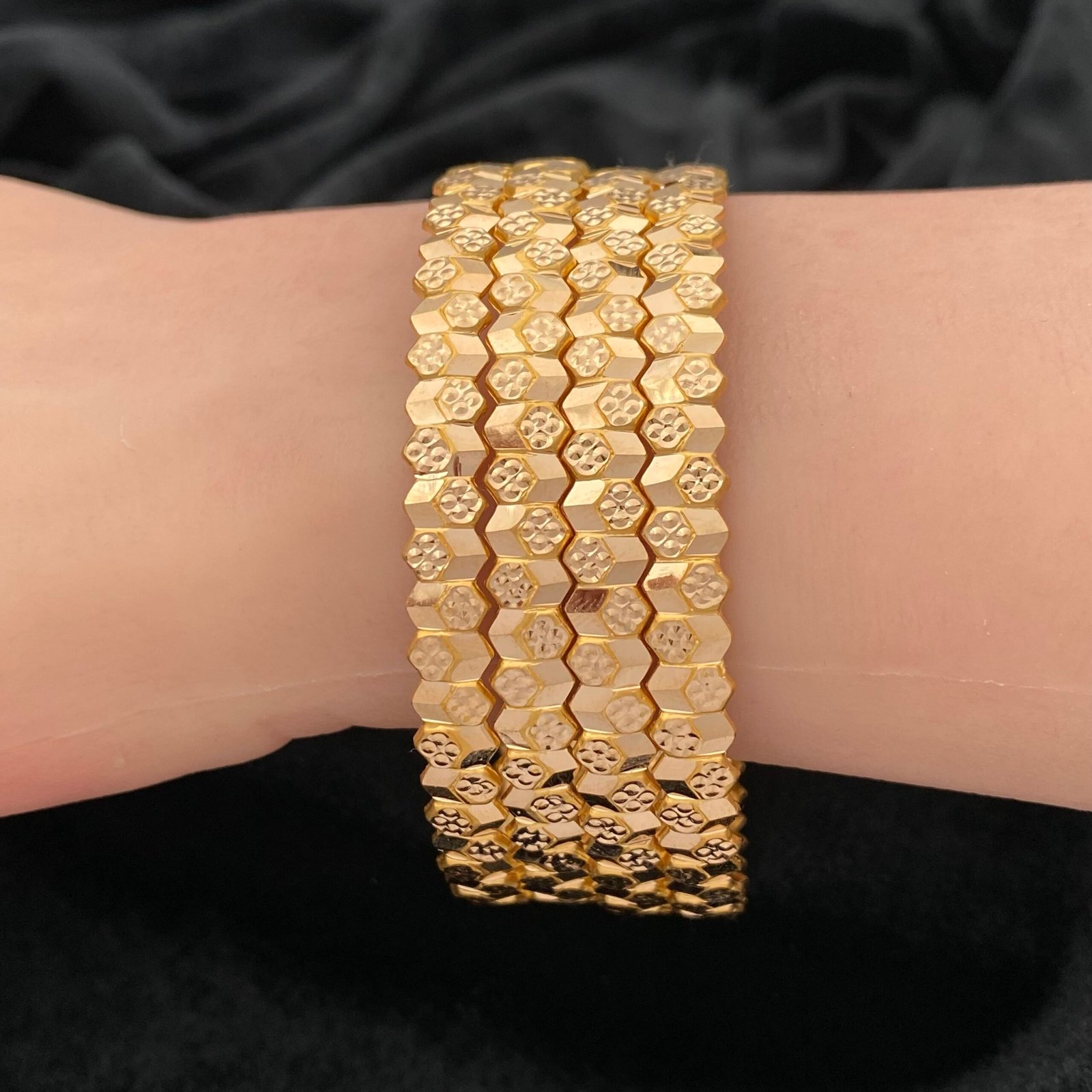 تألقي ببريق لا يخفت مع غويشة ذهب عيار 21 بوزن 8.03 جرام، التي تضيء حضوركِ بتصميمها المميز على شكل وحدات هندسية متداخلة تشبه خلية النحل أو الزهور. هذه القطعة الفريدة من الذهب الخالص تمنح معصمكِ إطلالة أنيقة وملفتة، تسوقيها الآن حصرياً في متجر قمة زاوية الشفاء.