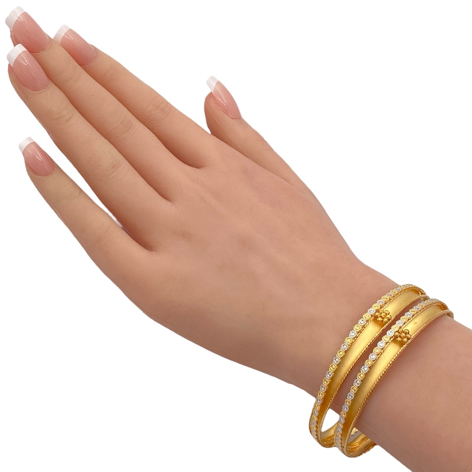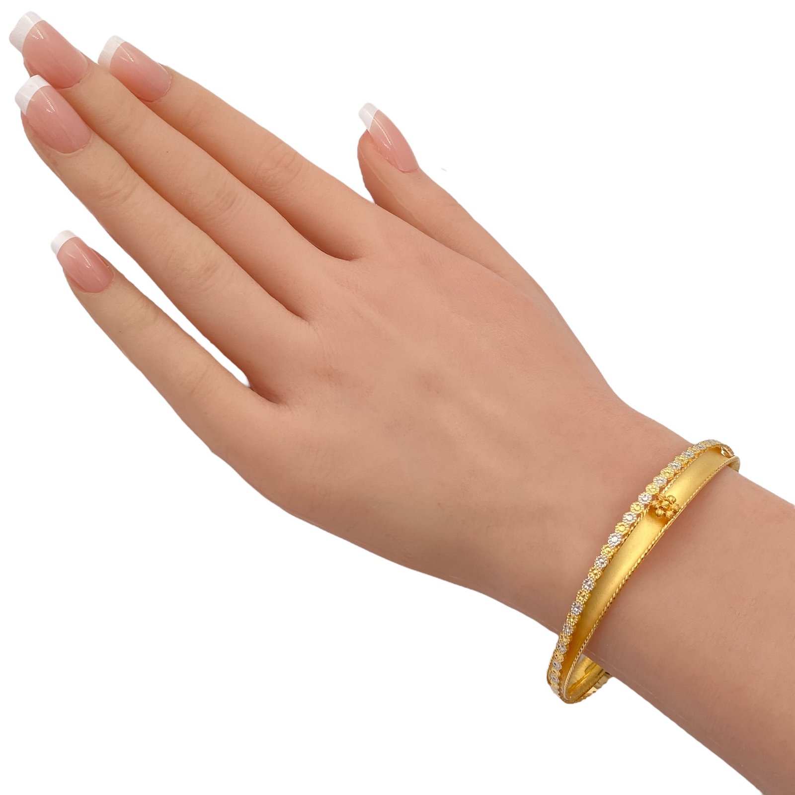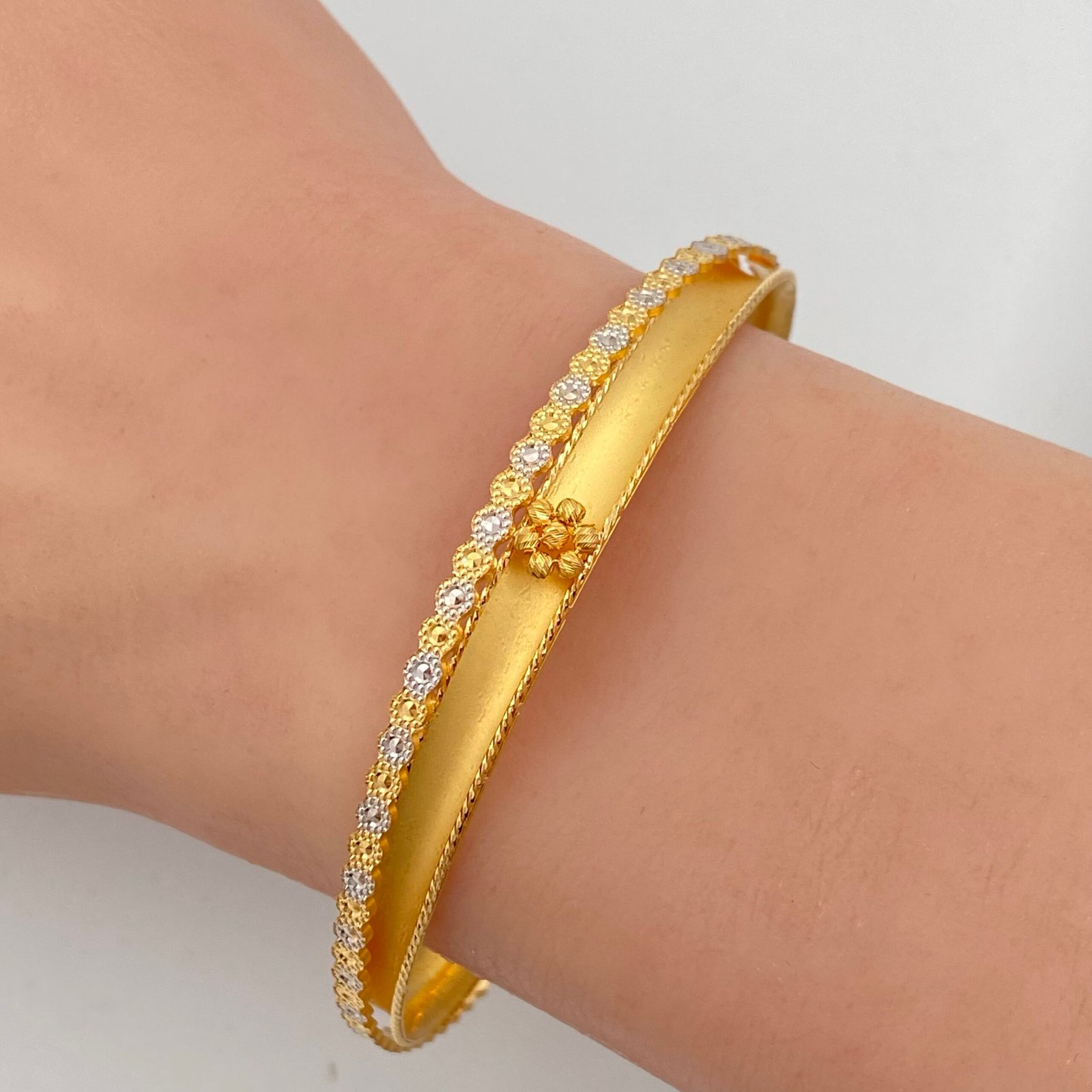 اخطفي الأنظار بتصميم يفيض بالأنوثة والجمال، مع غويشة ذهب عيار 21 الساحرة بوزن 13.43 جرام. تجمع هذه القطعة بين روعة اللونين الأبيض والأصفر لتمنحك إطلالة فريدة تجمع بين النعومة والرُقيّ. تتوسطها زهرة ذهبية أنيقة تضيف لمسة من البهجة والفخامة إلى معصمك، لتكون خيارك الأمثل في كل مناسبة.